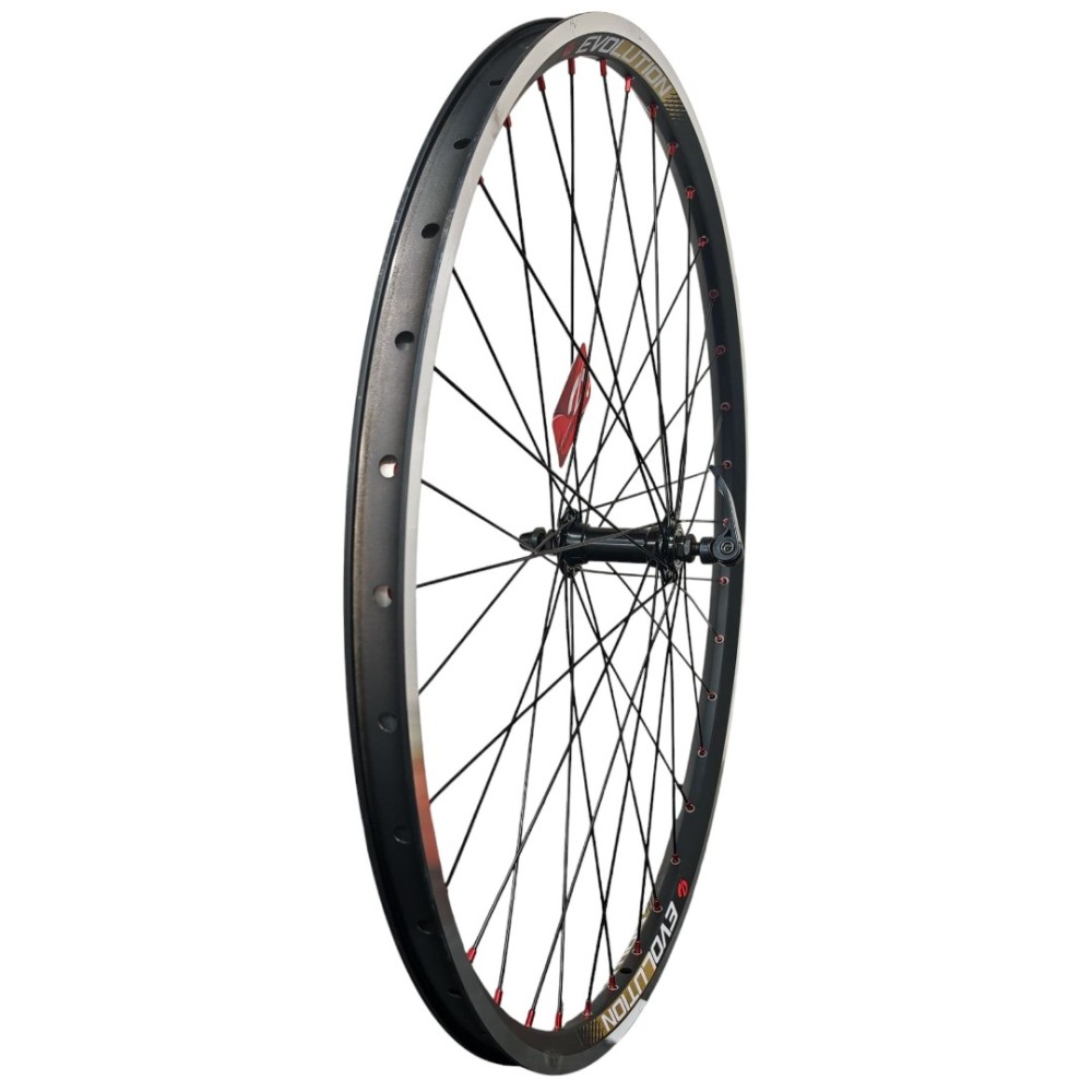 Колесо переднее 29" EVOLUTION - алюминиевый двойной пистонированный чёрный обод c серебристой тормозной дорожкой под 36 спиц, алюминиевая втулка под тормоз V-brake, эксцентрик, пром. подшипники, чёрные спицы, красные ниппеля.